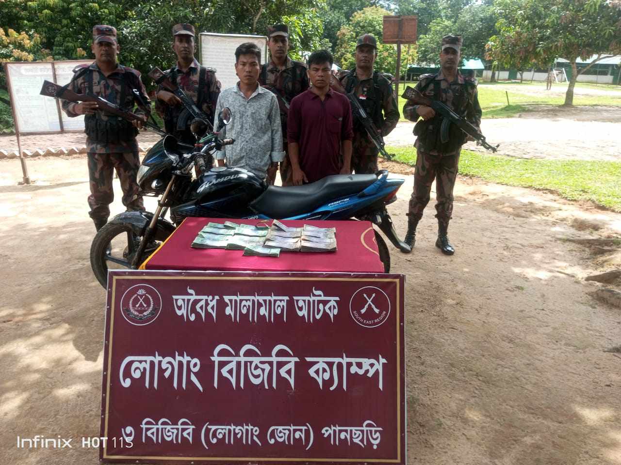 বিজিবি সুত্রে জানা যায়, গতকাল রবিবার (২৪ সেপ্টেম্বর/২৩) সকাল ১০ টায় জেলার পানছড়ির সিমান্ত সংলগ্ন লোগাং বিজিবি ক্যাম্পের চেক পোষ্টে মোটর সাইকেলে দুই আরোহিকে সন্দেহজনক ভাবে থামানো হলে বস্তার ভিতর টাকার বান্ডিল সদৃশ্য দ্রব্যের অবস্থান আঁচ করতে পেরে জিজ্ঞাসাবাদের জন্য আটক করেন ক্যাম্প কমান্ডার নায়েব সুবেদার মোঃ মোফাজ্জল হোসেন।