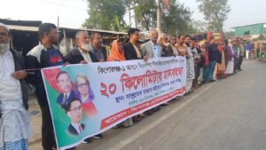 কিশোরগঞ্জ-১ আসনে বিএনপির মনোনয়নবঞ্চিত নেতাকর্মীদের ২০ কিলোমিটার দীর্ঘ মানববন্ধন। ছবি: আস্থা