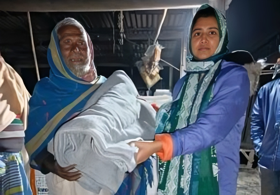 ইউএনও কাজী নাহিদ ইভা বাজার ও রাস্তাঘাট ঘুরে ঘুরে শীতবস্ত্র বিতরণ করছে। ছবি: আস্থা কিশোরগঞ্জের হোসেনপুর উপজেলায় সুবিধাবঞ্চিত ও অসহায়