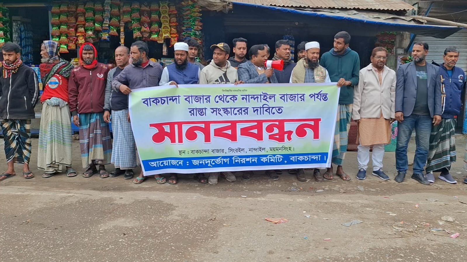 বাকচান্দা বাজার থেকে নান্দাইল বাজার পর্যন্ত সড়ক দ্রুত সংস্কারের দাবিতে মানববন্ধন। ছবি: আস্থা ময়মনসিংহের নান্দাইল উপজেলায় দীর্ঘদিন ধরে বেহাল অবস্থায়
