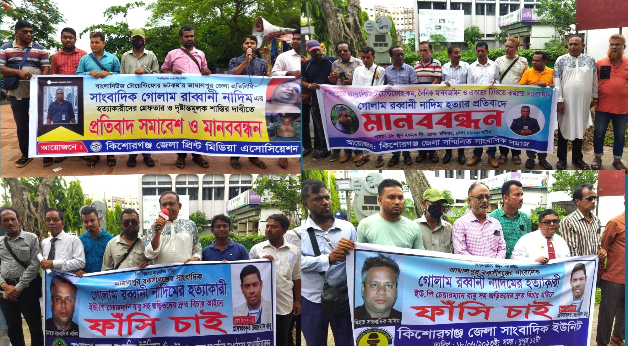 সংবাদ প্রকাশের জেরে জামালপুরের বকশীগঞ্জের সাংবাদিক গোলাম রাব্বানী নাদিমকে হত্যার প্রতিবাদে ও হত্যাকারীদের দৃষ্টান্তমূলক শাস্তির দাবিতে কিশোরগঞ্জে মানববন্ধন ও প্রতিবাদ