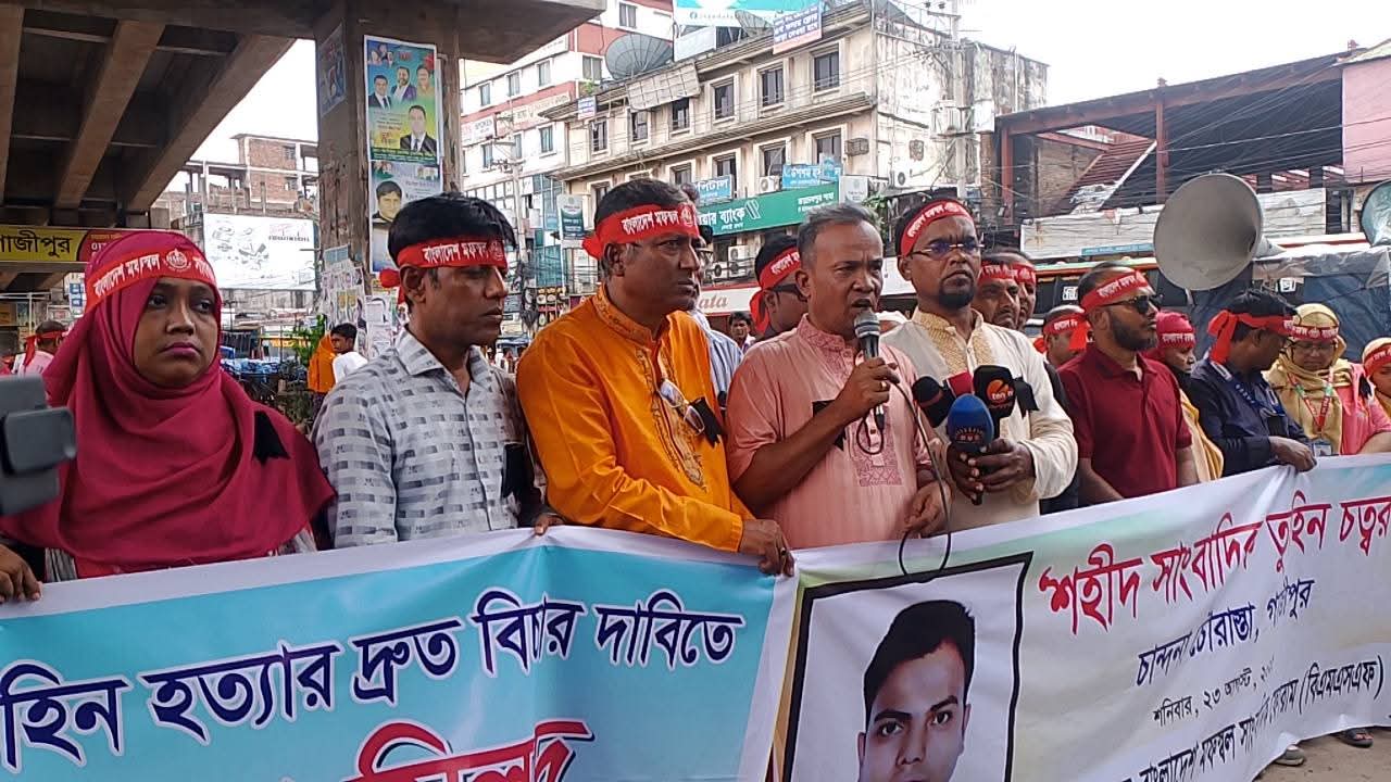বাংলাদেশ মফস্বল সাংবাদিক ফোরাম (বিএমএসএফ)-এর উদ্যোগে গাজীপুরের চান্দনা চৌরাস্তায় সাংবাদিক নির্যাতন ও হত্যার প্রতিবাদে এবং শহীদ সাংবাদিক আসাদুজ্জামান তুহিনের স্মৃতিকে