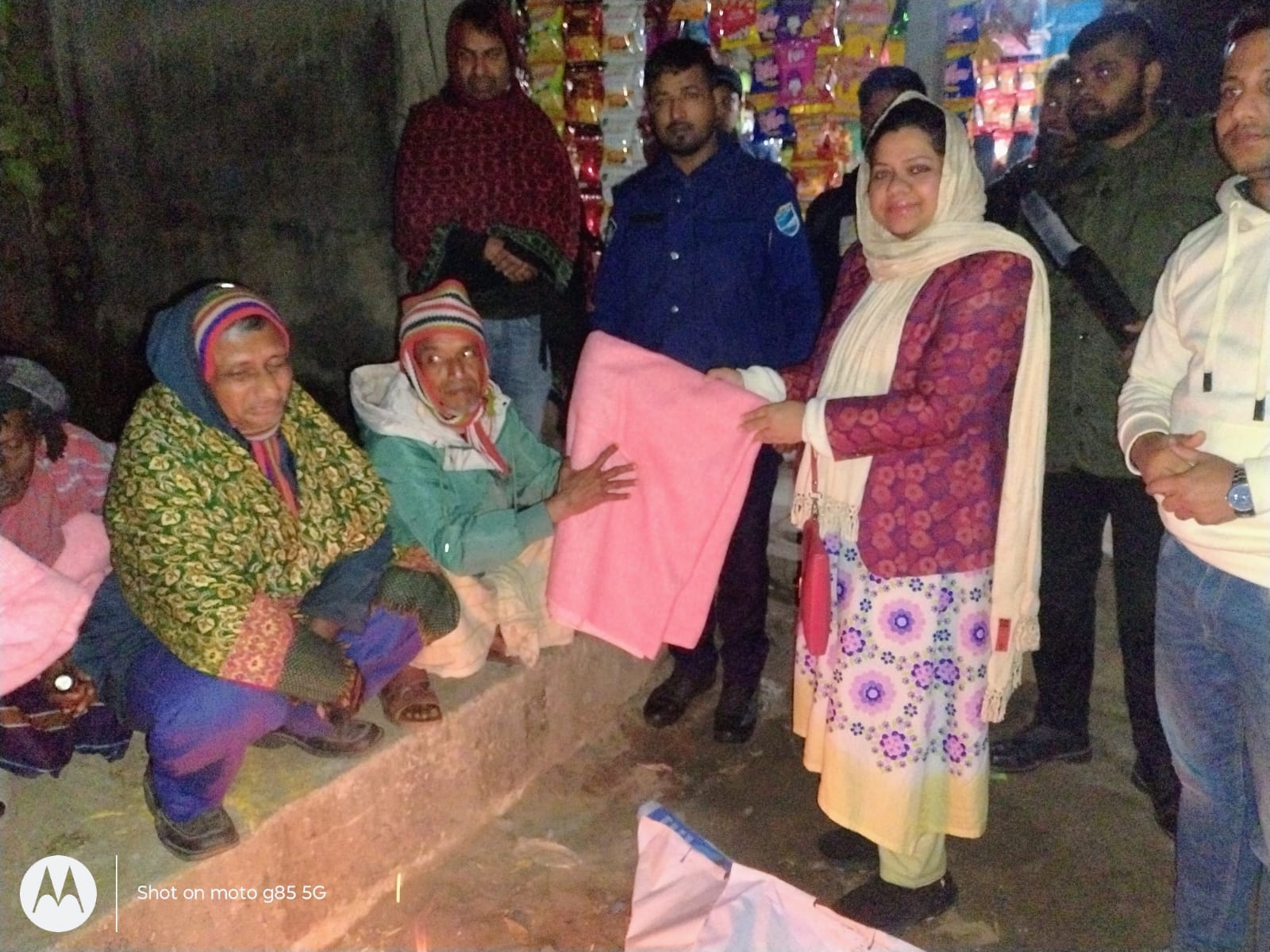 ইউএনও তাহমিনা আক্তার বাজার ও রাস্তাঘাট ঘুরে ঘুরে শীতবস্ত্র বিতরণ করছে। ছবি: আস্থা কিশোরগঞ্জের করিমগঞ্জ উপজেলায় তীব্র শীতে দুস্থ ও