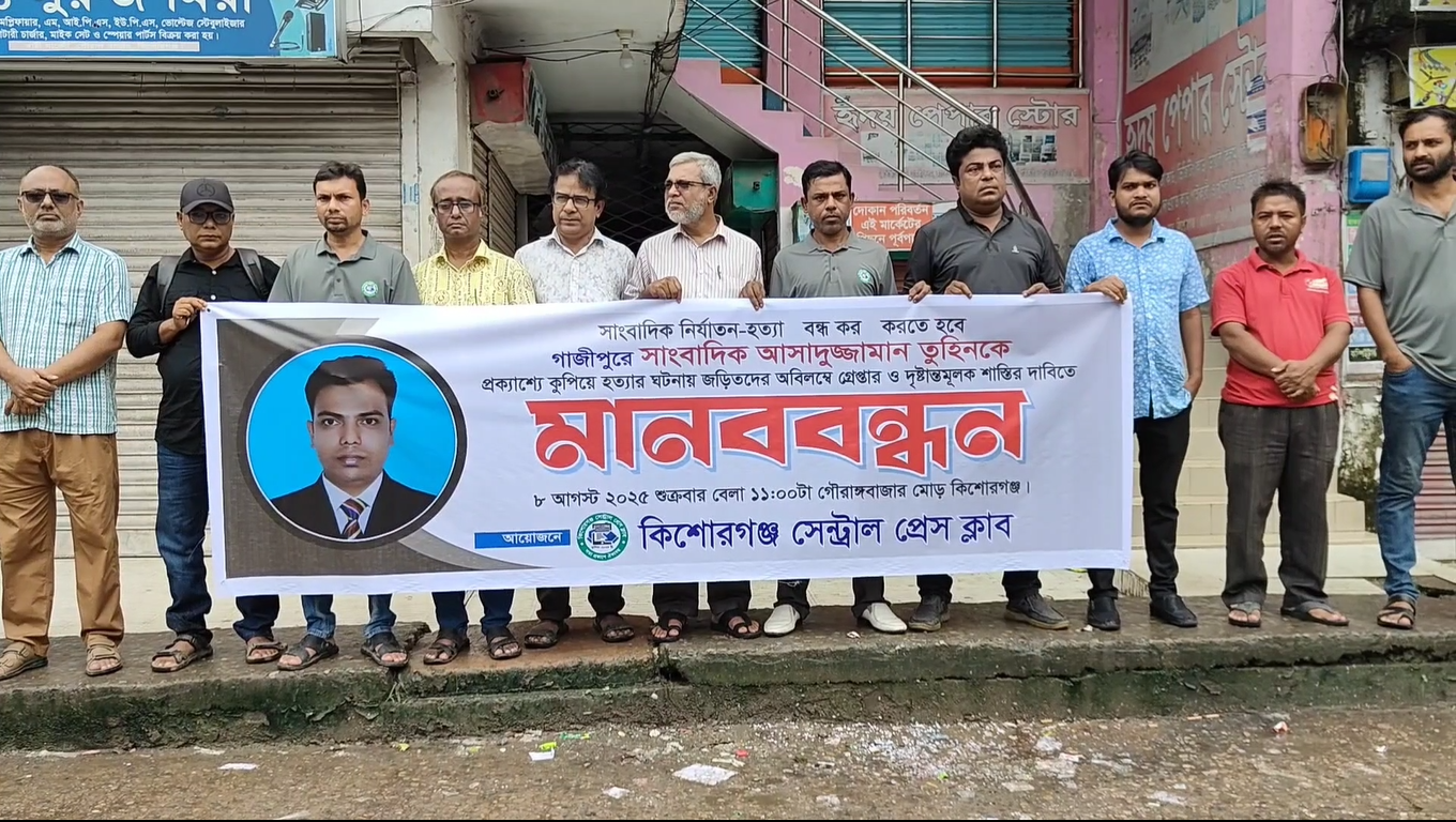 গাজীপুরে সাংবাদিক মো. আসাদুজ্জামান তুহিন হত্যার প্রতিবাদে কিশোরগঞ্জ মানববন্ধন অনুষ্ঠিত হয়েছে। শনিবার (০৯ জুলাই) দুপুর ১২ টায় কিশোরগঞ্জ প্রেসক্লাবের উদ্যোগে
